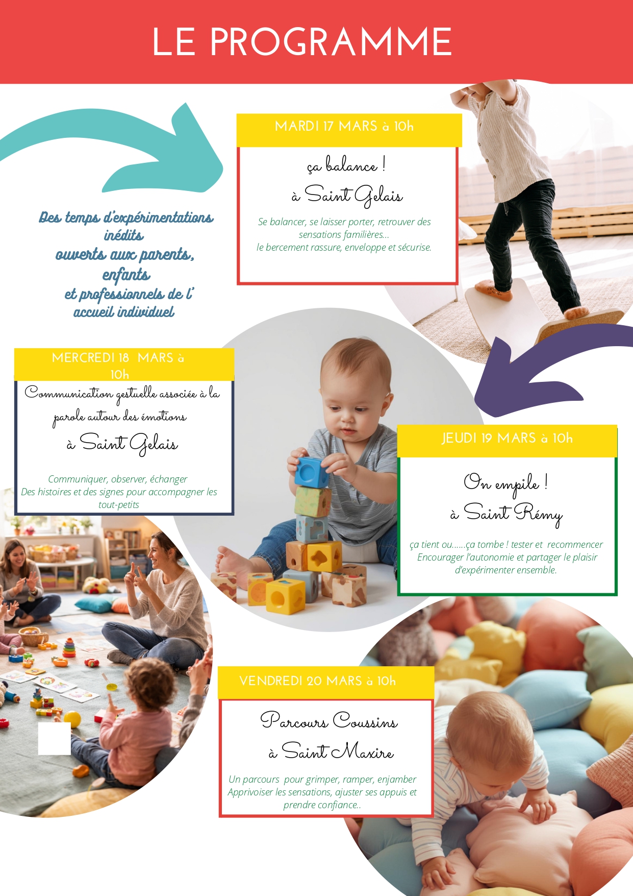 Le Relais Petite Enfance vous propose des temps d’expĂ©rimentations inĂ©dits, ouverts aux parents, enfants et professionnels de l’accueil individuel đŸ€ du 14 au 21 mars.