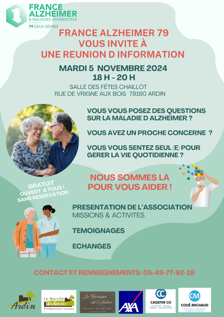 France Alzheimer 79 vous invite à une réunion d’information le Mardi 5 Novembre 2024 à 18 heures