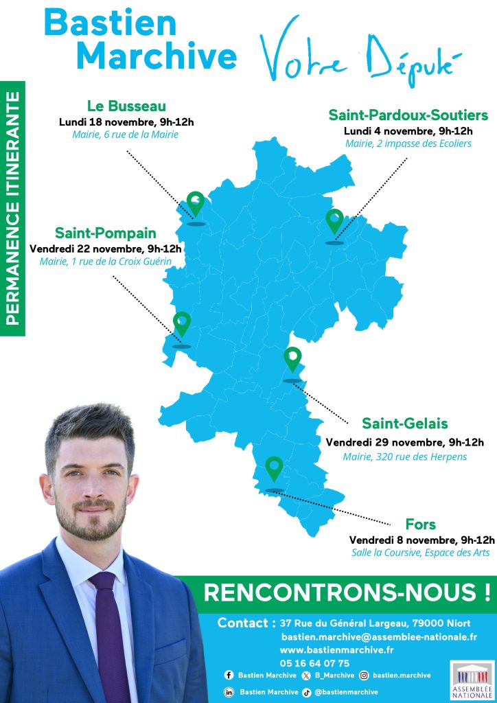 Nous vous informons que Monsieur le Député, Bastien Marchive, organise de nouvelles permanences décentralisées pour aller à la rencontre de tous, dans sa circonscription qui compte 58 communes. Il sera ainsi à : Saint Pardoux Soutiers : Lundi 4 novembre, de 9h à 12h, Mairie, 2 impasse des Ecoliers Fors : Vendredi 8 novembre, de 9h […]