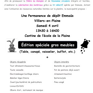 Envie de faire du tri utile ? Bonne nouvelle ! La permanence de dépôt Emmaüs revient – édition spéciale gros meubles ! Samedi 4 avril 13h30 – 16h00 Cantine de l’école de la Plaine Ensemble, donnons une nouvelle vie à vos objets ! On compte sur vous… et n’hésitez pas à partager !