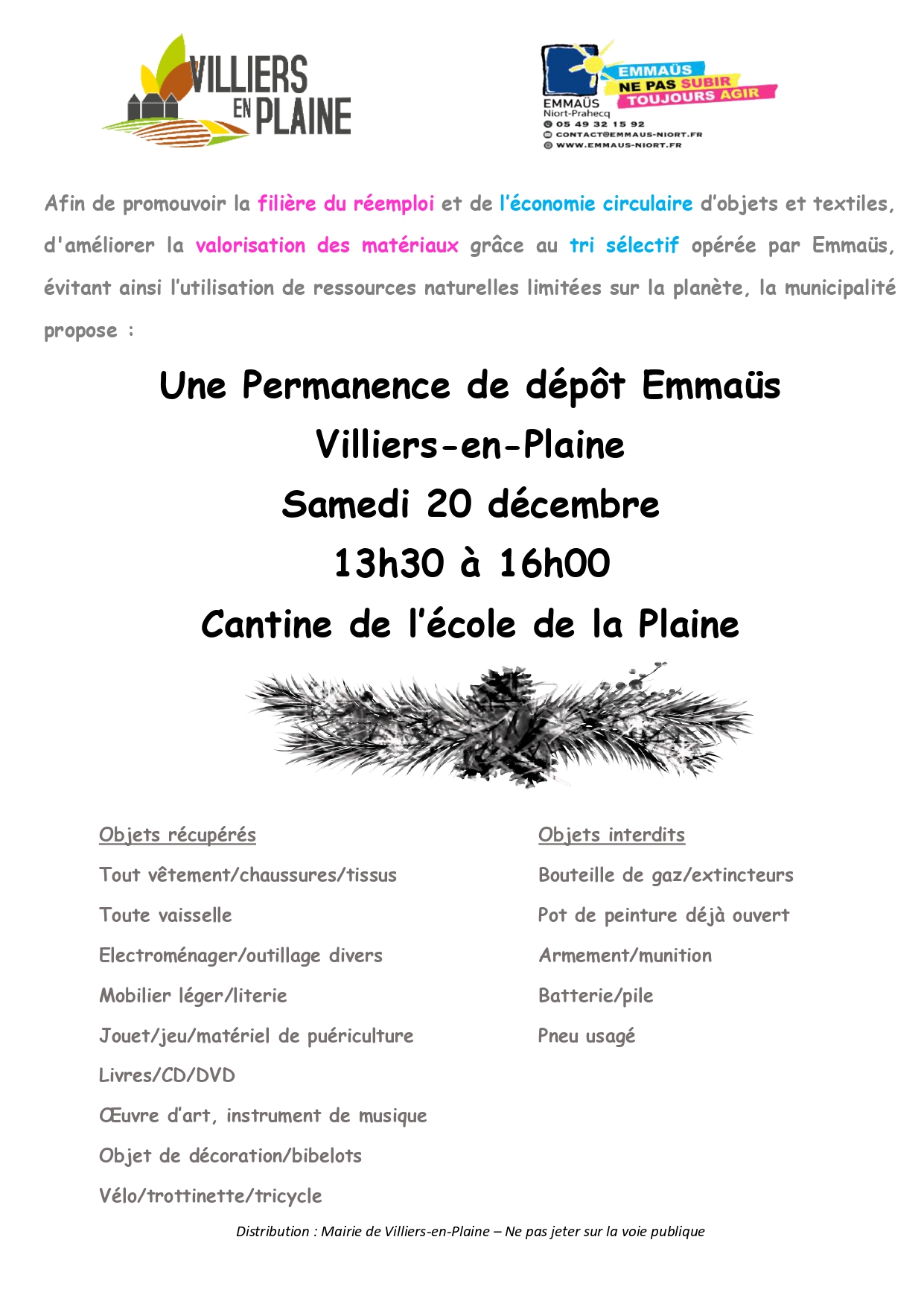 Dans le cadre de son engagement pour le réemploi, l’économie circulaire et la préservation des ressources naturelles, la municipalité organise une nouvelle permanence de dépôt Emmaüs !