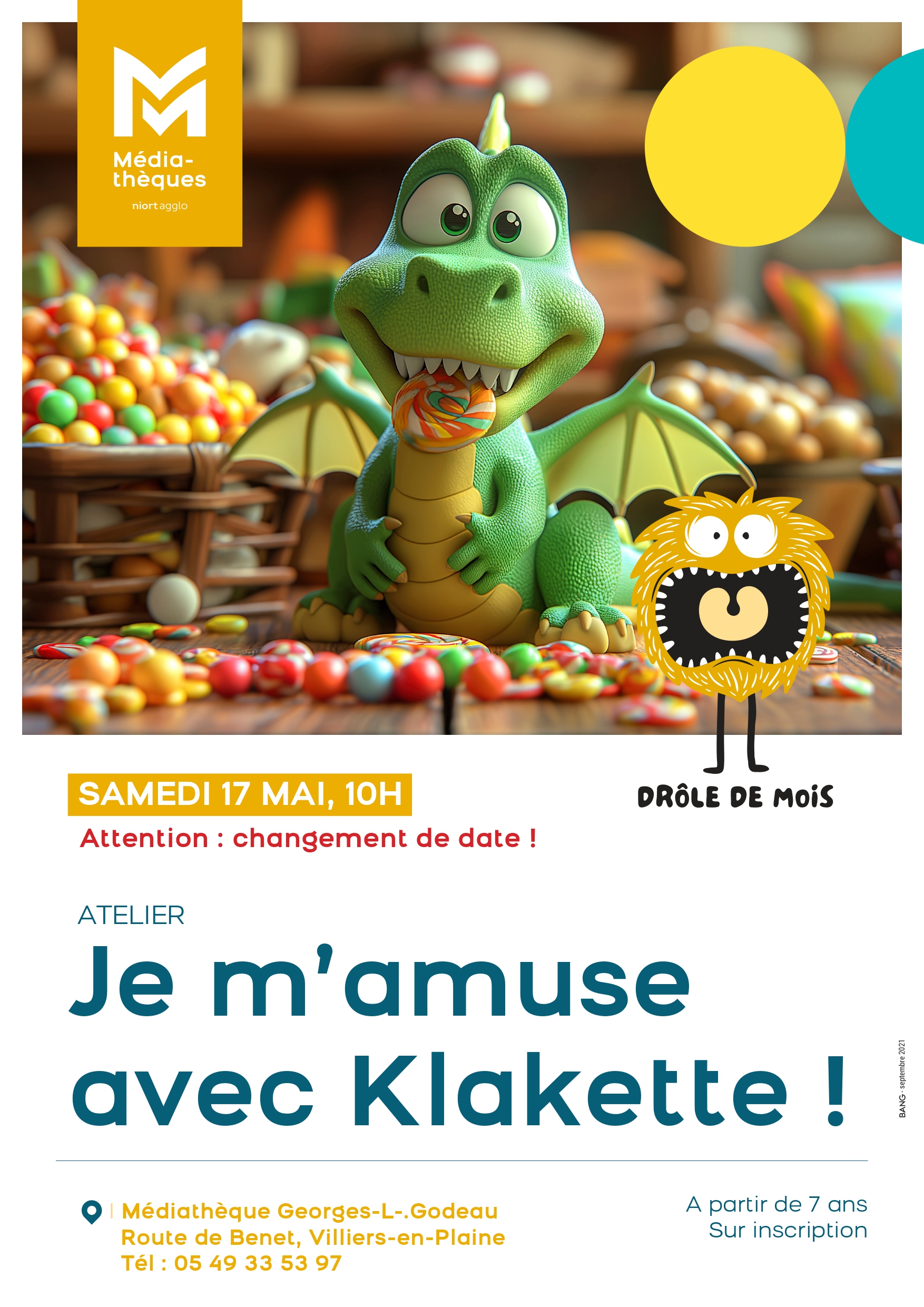 🎨✨ ATELIER LUDIQUE ET CRÉATIF AVEC KLAKETTE ! ✨🎨 ATELIER LUDIQUE ET CRÉATIF AVEC KLAKETTE ! Le 17 Mai 2025 De 10h à 12h Médiathèque Georges-L. Godeau Pour les enfants de 7 à 10 ans Rejoignez-nous pour un moment de créativité et de fun avec Klakette, illustratrice talentueuse ! Au programme : dessin, imagination et bonne humeur Inscription obligatoire au 05 49 33 53 97 Ne manquez pas cette occasion unique pour les jeunes artistes en herbe ! + Ajouter à mon Agenda Google + Exportation iCal / Outlook Date 17 Mai 2025 Expiré! Heure 10:00 - 12:00 Lieu Médiathèque Georges-L. Godeau Partagez cet événement