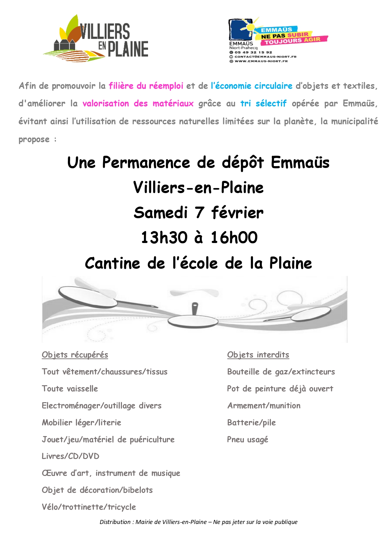 Permanence de dépôt Emmaüs Envie de faire du tri utile ? Bonne nouvelle ! Une permanence de dépôt Emmaüs arrive à Villiers-en-Plaine Samedi 7 février 13h30 – 16h00 Cantine de l’école de la Plaine C’est l’occasion parfaite de donner une seconde vie à vos objets et de faire un geste solidaire + Ajouter à mon Agenda Google + Exportation iCal / Outlook Date 07 Fév 2026 Expiré! Heure 13:30 - 16:00 Partagez cet événement