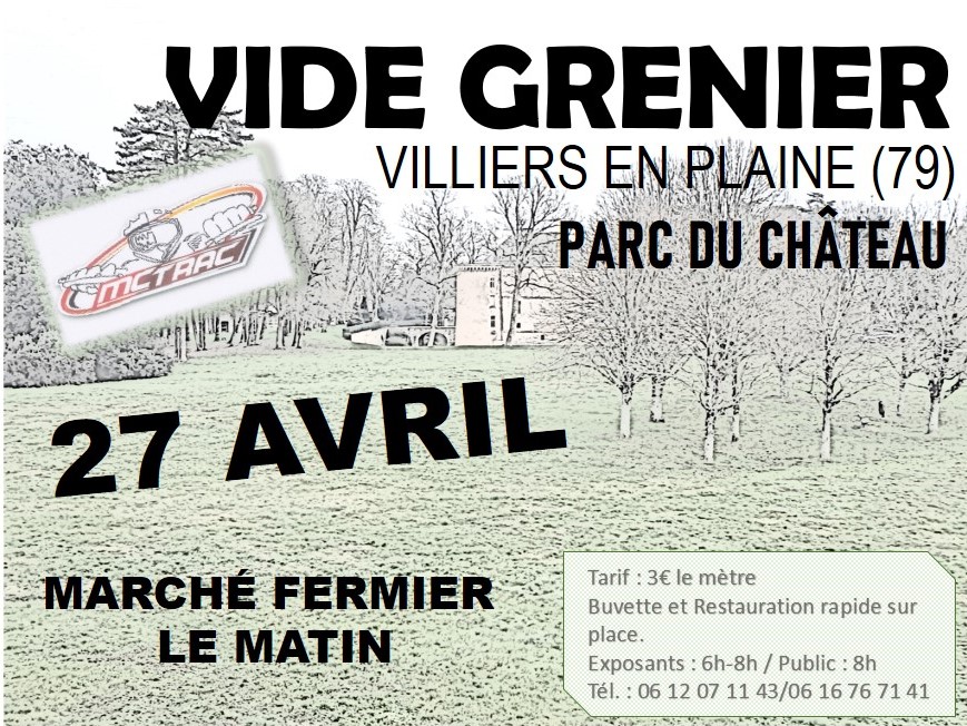 Vide Grenier le 27 avril dans le parc du Château [ VIDE-GRENIER ] L’ association MC TRAC organise son vide grenier dimanche 27 avril 2025 dans le parc du château. Nombreux exposants, restauration sur place… tout est prévu pour que vous passiez un bon moment Partagez l’événement et venez nombreux ! + Ajouter à mon Agenda Google + Exportation iCal / Outlook Date 27 Avr 2025 Expiré! Heure 08:00 - 08:00 Lieu Parc du château villiers-en-plaine Partagez cet événement